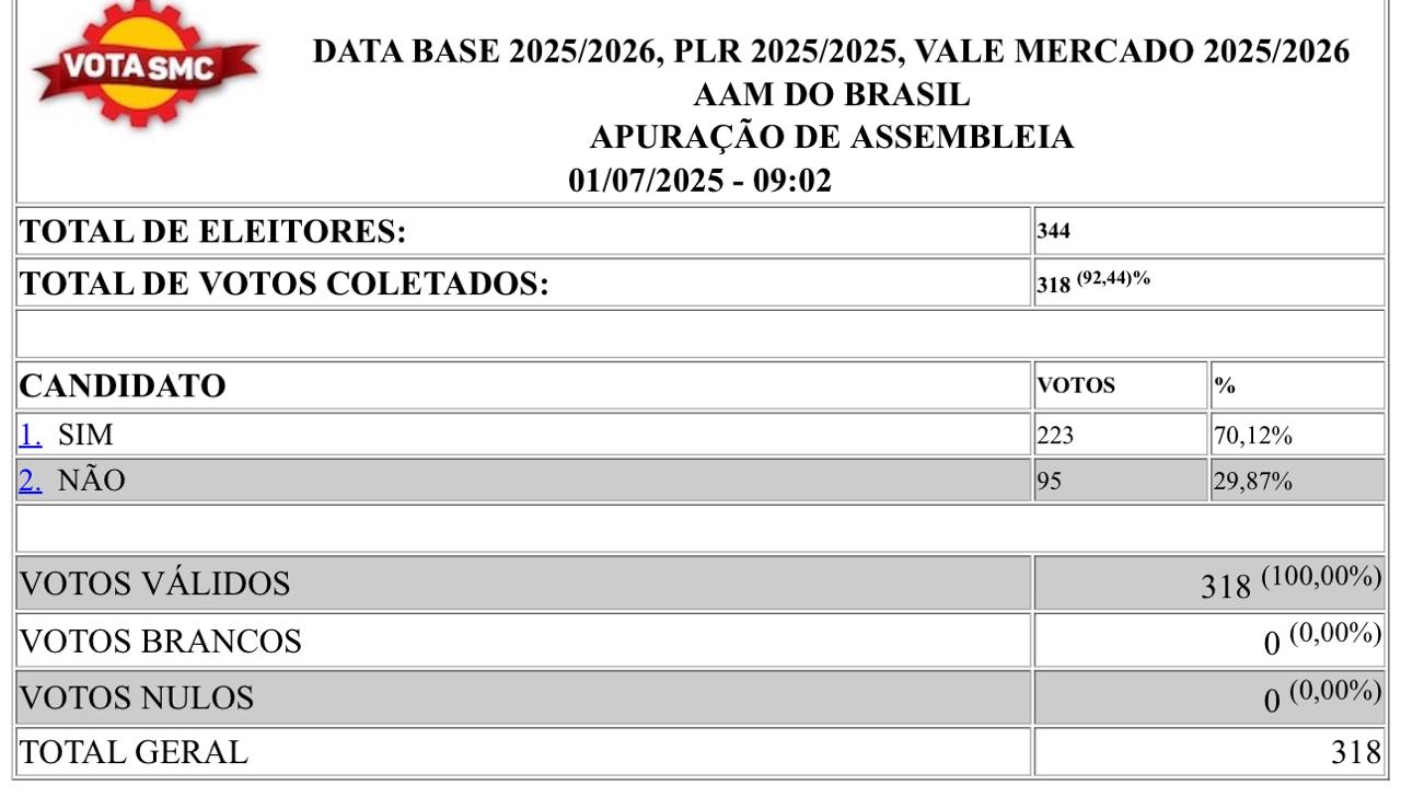 Em votação secreta realizada nesta segunda-feira (30/06) e terça-feira (01/07) pelo “votasmc” a maioria dos metalúrgicos aprovou a proposta do Acordo Coletivo de Trabalho (ACT-2025/26) construída entre diretores sindicais e empresa, e explanada em assembleia na porta de fábrica nesta segunda.